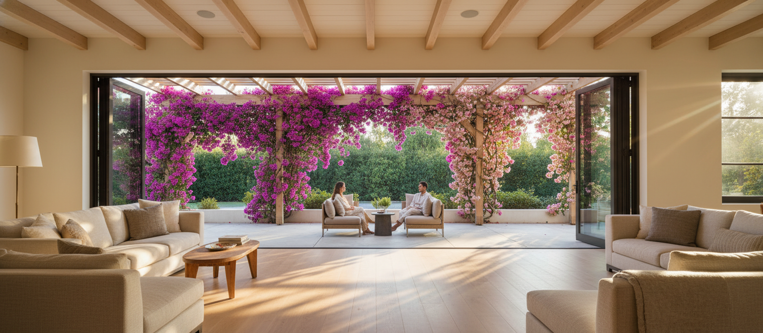 Folding glass walls (LaCantina, Western Window Systems, Fleetwood). Pocketing slider doors. Covered patios that become extensions of the kitchen and living room. The LA fantasy that actually works year-round.